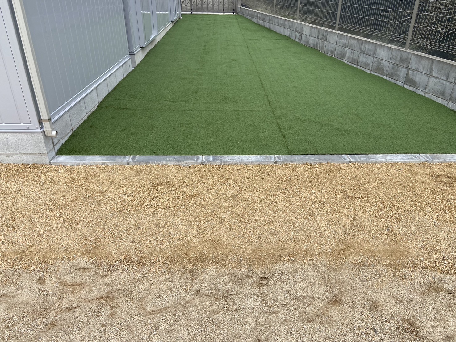 イナバのガレージの横にはバイク車庫、その前には人工芝で仕上げたドッグランを作り、後ろには家庭用の畑を作らせて頂きました。施主様は大変喜んでいました。